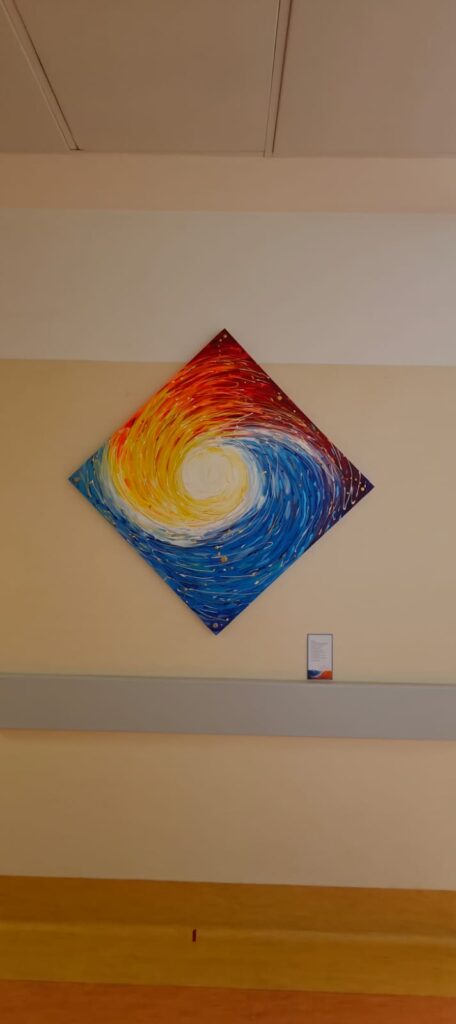 L’artista dell’opera, Debora De Massimo, paziente FC del Centro di Cerignola e membro del consiglio direttivo di LIFC PUGLIA, in una immagine astratta, ricca di colore e significato, ha voluto rappresentare simbolicamente un vortice di:
